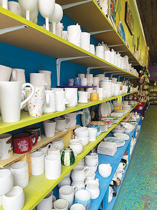 “This is a teaching studio, and we offer traditional and unique techniques as part of the experience, such as using lace or cheese cloth, netting, or eyelash yarn, which leave patterns in the piece, as well as bubbles, stamps, paper cut-outs, and specialty “reactive” glazes with crystals that explode in the kilns, causing background color with bursts of color on top,” says Debra. “One of the fun parts of the process is that you don’t really know what it is going to look like until it is fired in the kiln—so it’s a surprise because the colors get brighter and the finish is glossy. Many artists come in that usually work in mediums other than pottery, and they learn that painting pottery is a completely different technique than other types of painting, so it’s a new challenge even for people that are very experienced. On the other hand, people without any experience at all with art can enjoy it as well, even little kids.”