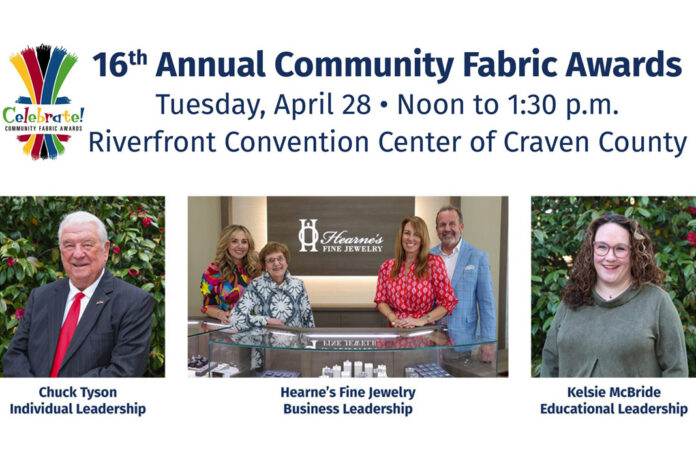 The awards will be presented on Monday, April 28 at noon at the Riverfront Convention Center of Craven County. The annual event celebrates leaders who help weave the social and economic fabric of the region through service, innovation, and dedication to others.