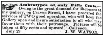 Finally, in 1859, J. W. Watson advertised his “gallery” on New Bern’s Craven Street in the Daily Progress newspaper. Watson boasted that business “for likenesses” was so steady that he’d enlisted the services of two cameramen to handle all the traffic. Fifty cents “and upwards” would cover the cost of a picture.