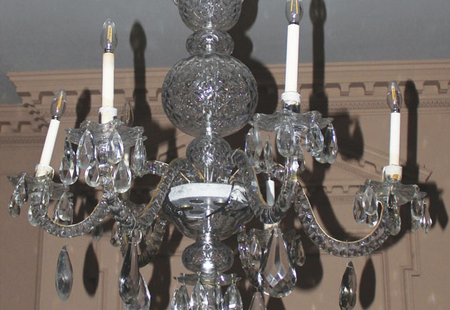 Repairs were made to the glass using a conservation adhesive that requires two weeks to bond and dry. The entire chandelier was then cleaned and rehung in the Stanly parlor. It continues to provide light for visitors daily.