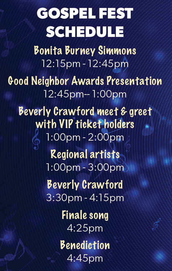 Beverly Crawford, a Gainesville, Florida-based pastor, Grammy award-nominated recording artist, and Stellar-Award winner, is this year’s featured guest Gospel performer! New Bern’s own Bonita Burney Simmons, a nationally and internationally recognized award-winning Gospel artist, will open the afternoon with her usual rousing performance, followed by other local and regional artists.