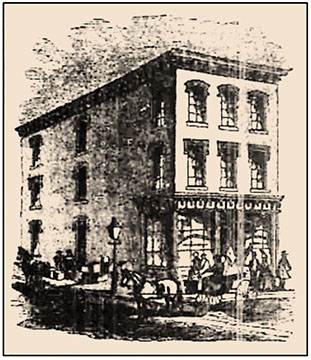 The newspaper woodcut of Cuthbert’s three-story structure depicts locals in horse-drawn transportation with a stylish gas lamp on the street corner.