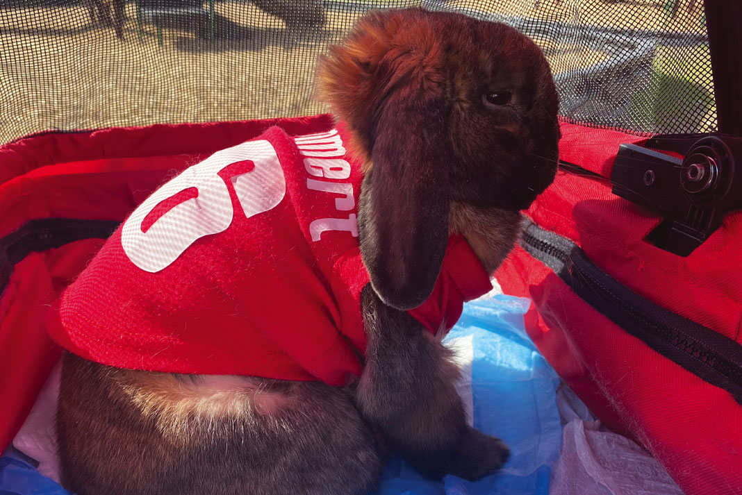 Barbara says, “My teacher’s assistant gave him to me from her first litter of bunnies. He loves to play games and gives kisses. He can play hide and seek, chase, and any ball games. But keep in mind that he cheats at basketball!”