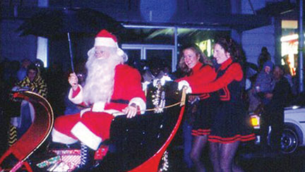 Linda related, “on the same day of the celebration, when we learned, the city staff had just finished hanging wreaths on the light poles, and still hadn’t turned any of the lights in the decorations on, we came up with the idea we would tie the lighting of the Christmas wreath decorations and Molly Heath tree lights with the Tree Lighting Ceremony so all of the lights would be tied to a timer and Santa, with a flick of his finger, could turn everything on at the same time. Around noon on December 5, as it began to rain, the temperature dropped and the rain turned into sleet. By 5 p.m. we knew we were in trouble. Everyone was freezing, children were crying, musicians could barely perform, so we cut that portion of the program short and everyone paraded to the Pollock/Middle Street intersection.