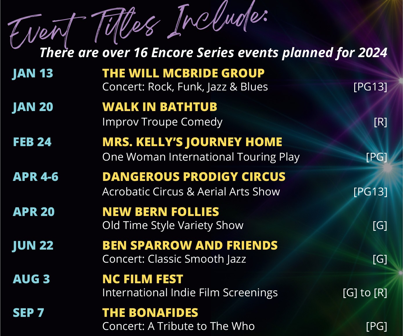 The Encore Series events in 2024 will include the New Bern Follies, Jazz concerts, the NC Film Fest, Folk-Rock concerts, aerial and circus arts, a gospel play, and even an all-puppet movie spoof. Something is happening live at NBCT nearly every weekend year-round.