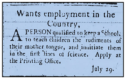 At right is a 1799 recruitment for a teacher from a local newspaper, the Newbern Gazette. It offers country employment to “a person qualified to keep school”; the elements of which would be “to teach children the rudiments of their mother tongue and initiate them in the first lines of science.”