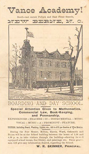 Per the National Register of Historic Places, in 1810, Samuel Simpson purchased the original portion of the house which stood at the southeast corner of Pollock and East Front Streets. In 1843 a huge fire destroyed a good portion of the homes on Pollock Street and it appears that Simpson’s federal style brick house was rebuilt between 1843-1846. (Sandbeck, Peter, The Historic Architecture of New Bern and Craven County, NC Architecture pgs.108-109, Tryon Palace Commission 1988). The house remained in the Simpson family until 1860 when it changed hands. During the Civil War, the house served as a Provost Marshal’s office and jail. Appleton and Augusta Oaksmith purchased the home sometime in 1874 and after 1884 began operating the Vance Academy, a boarding and day school, in the house.
