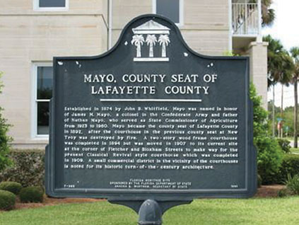 In a little town near the Florida Panhandle is located the county seat of Lafayette County – Mayo, Florida. The plaque in front of the local Court House commemorates the fact that the town is named for Confederate officer James Micajah Mayo.