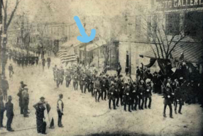 Ironically, at about the same time that we discovered this article in the paper, we found another reference to Hop Wah. While discussing New Bern’s historical photographers, Historical Society Curator Jim Hodges and I happened upon a photo which featured the Winstead Photographic studio at the corner of Middle and Pollock Street where the Elks’ building now stands. We found this photo in A New Bern Album, by John Green III, among pictures of a circa-1900 parade that passed by Mr. Winstead’s studio. According to Green, the showed, “The establishment of Mr. Hop Wah, New Bern’s own Chinese laundryman (small frame building to left of the photo gallery).” If you look at the photograph below, you will see the blue arrow pointing to the sign on the building that said “Hop Wah’s Laundry.” (A New Bern Album, pg. 117-118)