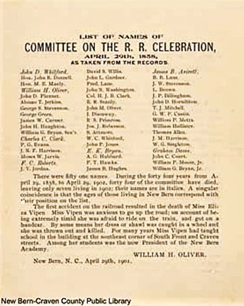 During this month in history, the completion of the Atlantic and North Carolina Railroad from Goldsboro to New Bern culminated in one of the biggest celebrations to ever take place in New Bern. A committee of fifty-one men were appointed to plan for a celebration to be held on April 29, 1858. Colonel John D. Whitford, president of the railroad, was named chairman of the ball committee, and William H. Oliver was appointed entertainment chair.
