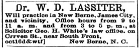 On October 16, 1891, a small announcement appeared in the Daily Journal (New Bern) as follows: “We publish in this issue the professional card of Dr. William L. Lassiter. Dr. Lassiter is a young colored man who recently graduated from the medical department of Howard University, District of Columbia, and comes here highly recommended, and is a native of North Carolina, from Northampton County.” This business card was published on the same date (note, the middle initial D. is incorrect).