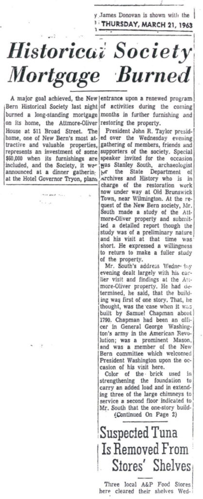 The house needed significant work, and the same Solicitors were sent out again to obtain donations for restoration and furnishings. Several businesses contributed not only money but building supplies, paint, and furniture as well. Many town members got into the spirit of resurrecting this old house and they succeeded. In less than 10 years the Society raised more than $65,000 to purchase, restore and furnish the Attmore-Oliver House — a huge sum for a recently resurrected nonprofit in a small town in the fifties. On March 20, 1963, at a meeting at the Governor Tryon Hotel, the mortgage on the Attmore-Oliver House was burned. President John R. Taylor’s leadership galvanized the Society and the townspeople to achieve this goal – an enormous task and accomplishment for New Bernians of that era.