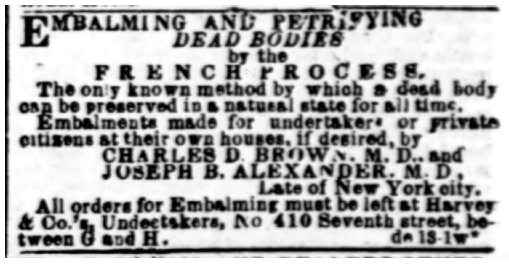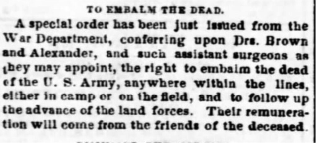 As the Civil War waged on, the federal government made Brown & Alexander the official embalmers for the Federal forces. On April 25, 1862, the Washington DC Evening Star, p. 2 reported.