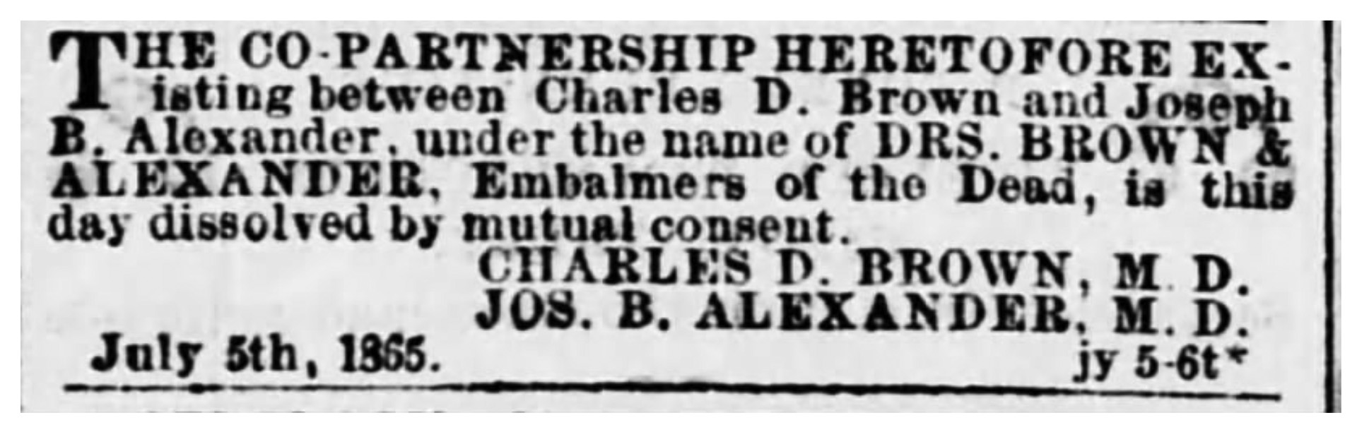 Prior to this move to Baltimore, in the late 1850’s, Joseph resided in New York City practicing medicine. We believe this is where he met Dr. Charles DeCosta Brown, his future partner. Dr. Brown studied and practiced medicine in Philadelphia after graduating from the University of Pennsylvania, but he then moved to New York City and practiced dentistry instead. After the Civil War broke out, one of his patients, Edward M. Stanton, Secretary of War, suggested to Dr. Brown that he become a surgeon/embalmer for the government as there was a great need for them due to the war. Dr. Joseph B. Alexander and Dr. Charles D. Brown formed a partnership as embalming surgeons and on December 13th of 1861 the Evening Standard, a Washington DC newspaper, ran this ad: