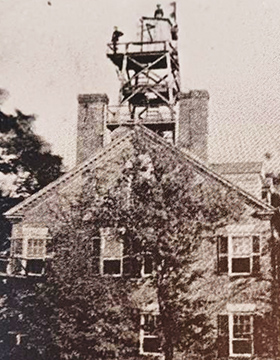 The black and white picture nearby is from local historian John Green’s book, A New Bern Album. It shows the Civil War-era “Crow’s Nest Signal Station” above the Jones-Jarvis home at the corner of East Front and Johnson Street. Green explained that the fastest way for the Union occupying force to communicate with the forts and troops around New Bern was with signal flags, lanterns, and flares. At this home, “Union engineers merely built a signal tower on top of the ‘captain’s walk’ already in place between the chimneys,” Green wrote. None of that structure survives today.