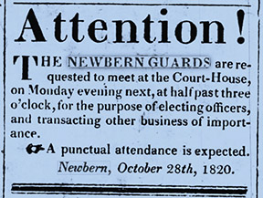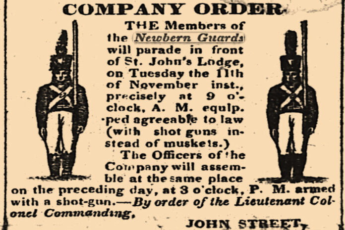 There’s plenty of evidence that “a well-regulated militia” was part and parcel of everyday life in long-ago New Bern. Take the nearby “company order” by Capt. John Street from the Newbern Sentinel of 1828 instructing the Newbern Guards to parade in front of St. John’s Lodge. The men were commanded to turn out with shotguns and to leave those muskets at home.