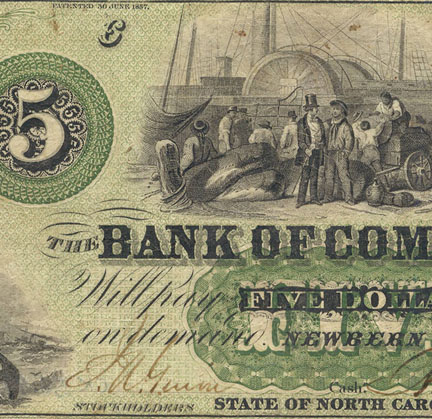 A few years ago, I came across a five dollar banknote issued by the Bank of Commerce of Newbern. The bill is dated January 1, 1861 and is signed by J.A. Guion, Cashier, and A.T. Jerkins, President. If you examine modern United States currency, you will see that signatures and dates are printed. In the days of the Bank of Commerce, banknotes and other forms of currency, such as money issued by the Confederate States of America, were hand signed and dated. This attested to the legitimacy of the note and provided a crude means of controlling counterfeiting. Before the War Between the States, the United States government didn’t issue paper currency as it does today, but it did mint gold and silver coins. States were banned from printing their own money by the Constitution, so banks became the primary suppliers of paper money. Theoretically, banknotes could be redeemed for gold and silver at the issuing bank, which is how this form of money derived its value. However, many banks did not have adequate gold and silver reserves, and therefore could not fulfill this promise. During its formative years, the United States financial system could be quite chaotic and unstable.