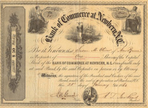 The signature of Alonzo Thomas Jerkins (1807 – 1895) also stands as a reminder of a person and family that heavily influenced New Bern. Alonzo’s father, Thomas Jerkins, was a sea captain that operated between New Bern and the West Indies. Thomas retired from sailing in 1824 after his wife died while he was away on an extended voyage. Alonzo was attending the University of North Carolina when his mother died. He decided to leave school and come back to New Bern, teaching school in his home. From those simple beginnings as a school teacher, Alonzo became recognized as a highly influential church leader, legislator, and businessman in New Bern’s history. He served as a trustee of the First Baptist Church and was elected in 1850 to represent Craven County in the North Carolina House of Representatives. In 1854, he was one of the original supporters of the Union Bank at Newbern. He was also one of the first directors of the Atlantic and North Carolina Railroad Company and held interest in both the Trent River Transportation Company and Neuse River Navigation Company. As we know, Alonzo was a founder and the first president of the Bank of Commerce. Without question, he had a significant impact on the development of banking and transportation in New Bern and Craven County.